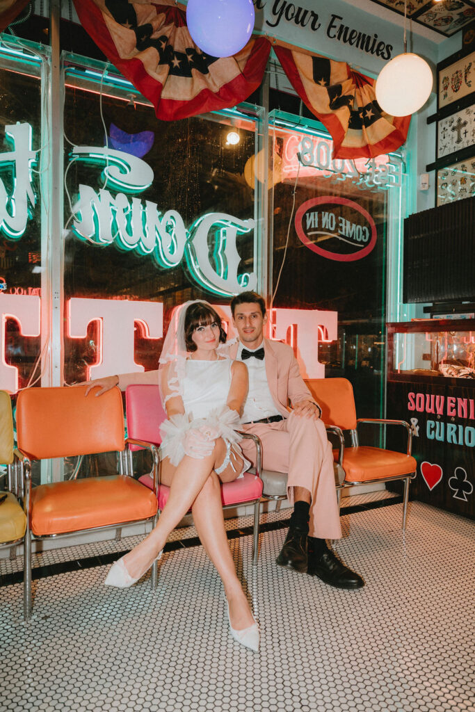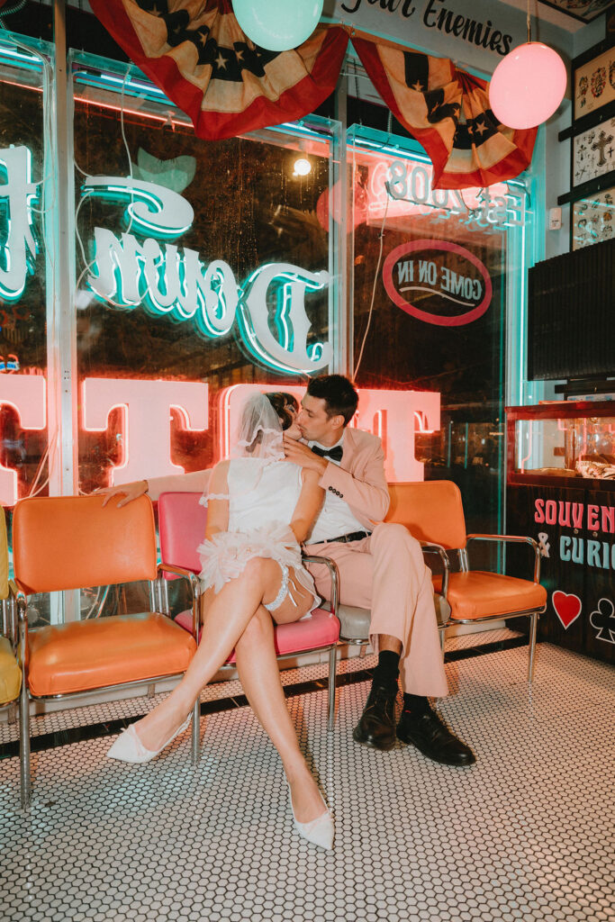 From the moment we connected, it felt like it was meant to be. We had one hour total. Thirty minutes inside the chapel, soaking in all the neon-lit, no-rules magic. Thirty minutes afterward getting tattoos because… obviously. No guests, no rigid timeline and no pressure to perform. Just the two of them showing up exactly as they are and choosing a wedding day that felt true to them.